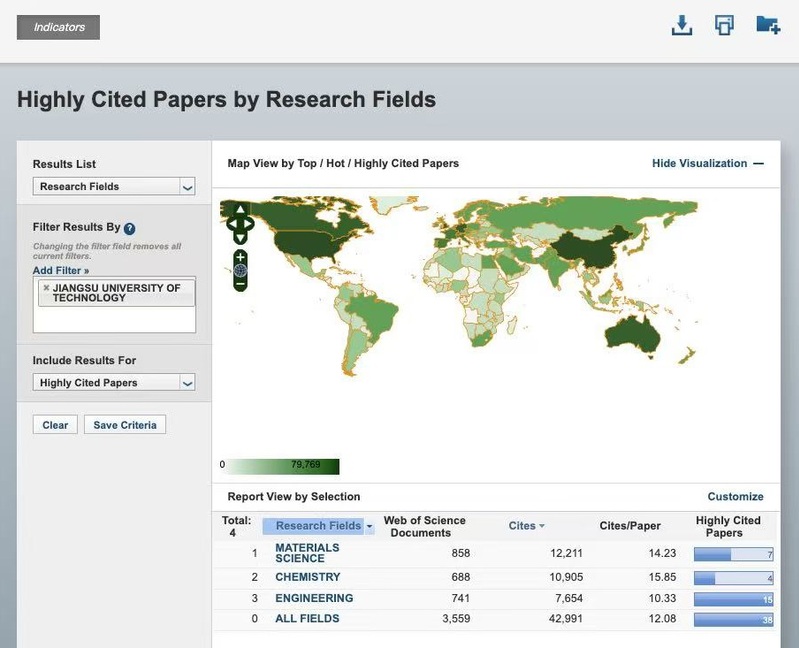 数据显示,我校共发表ESI论文3559篇,其中高被引论文38篇,总被引频次42991次;“工程学”学科领域发表论文741篇,其中高被引论文15篇,总被引频次7654次,篇均被引10.33次;“材料科学”学科领域发表论文858篇,其中高被引论文7篇,总被引频次12211次,篇均被引14.23次;“化学”学科领域发表论文688篇,其中高被引论文4篇,总被引频次10905次,篇均被引15.85次。(图文/诸一琦;审核/朱福先)